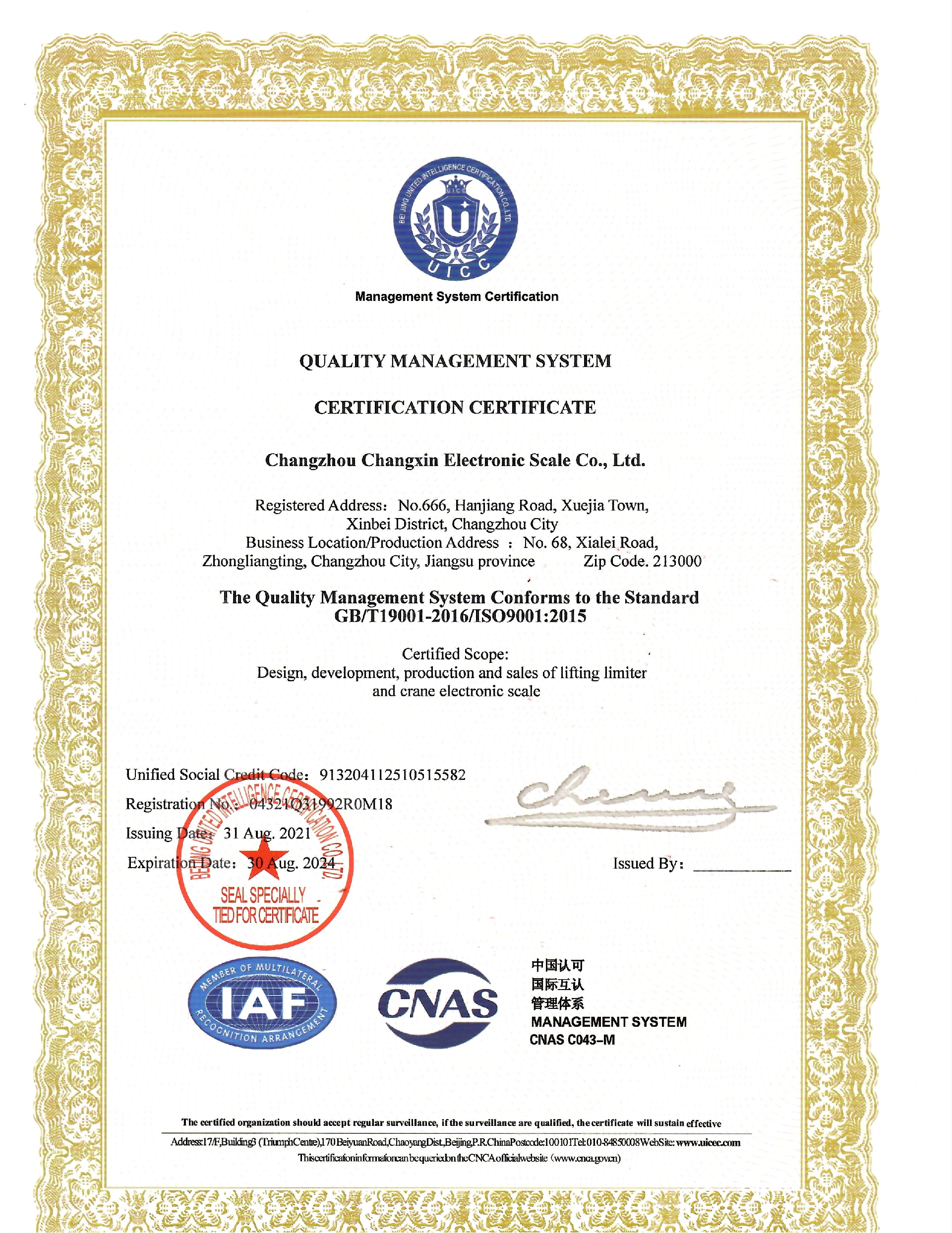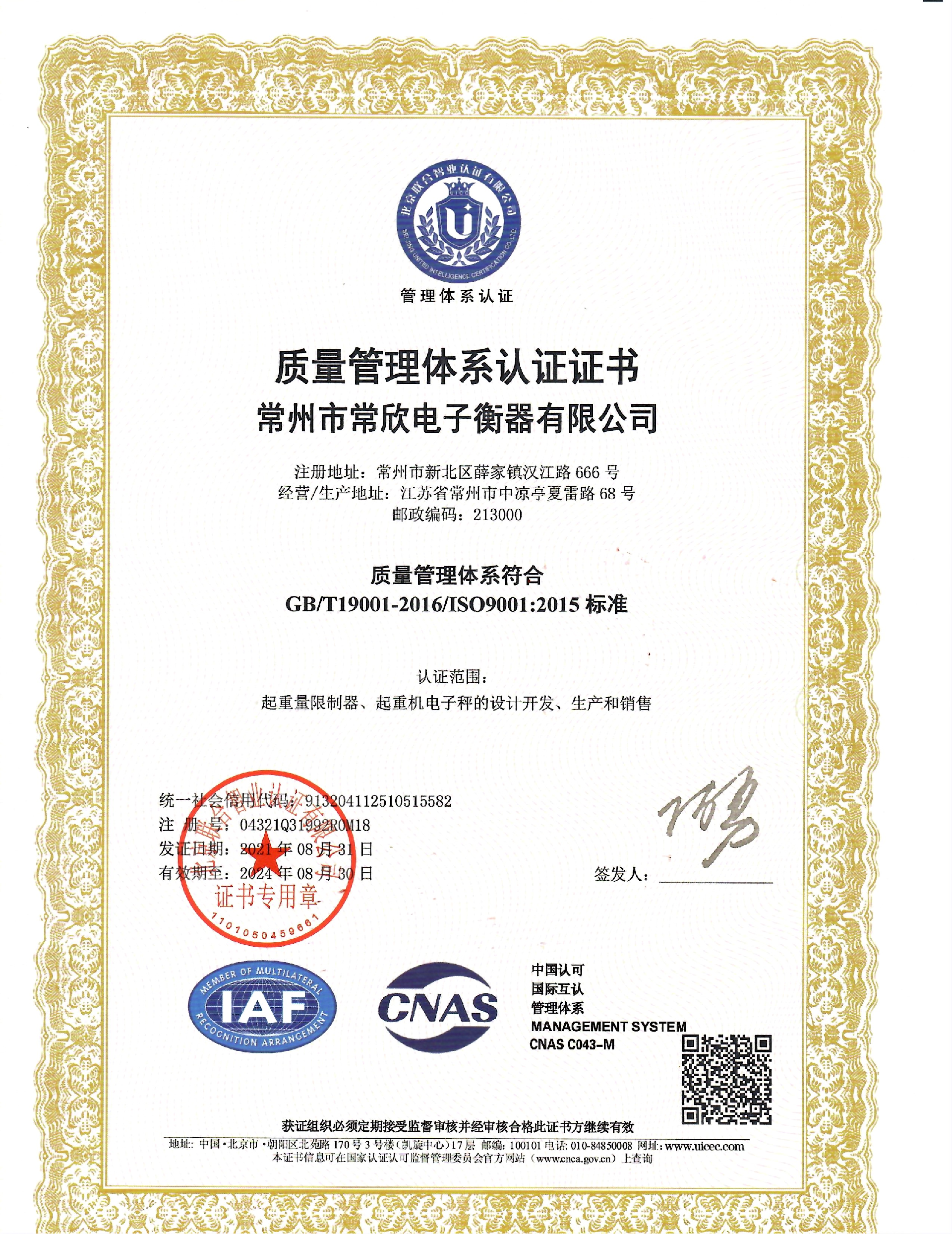 1998年12月,常欣公司率先在同行業(yè)中通過了IS09001質量體系的認證。2008年被確認為全國起重機械標準化技術委員會委員,參與制訂
